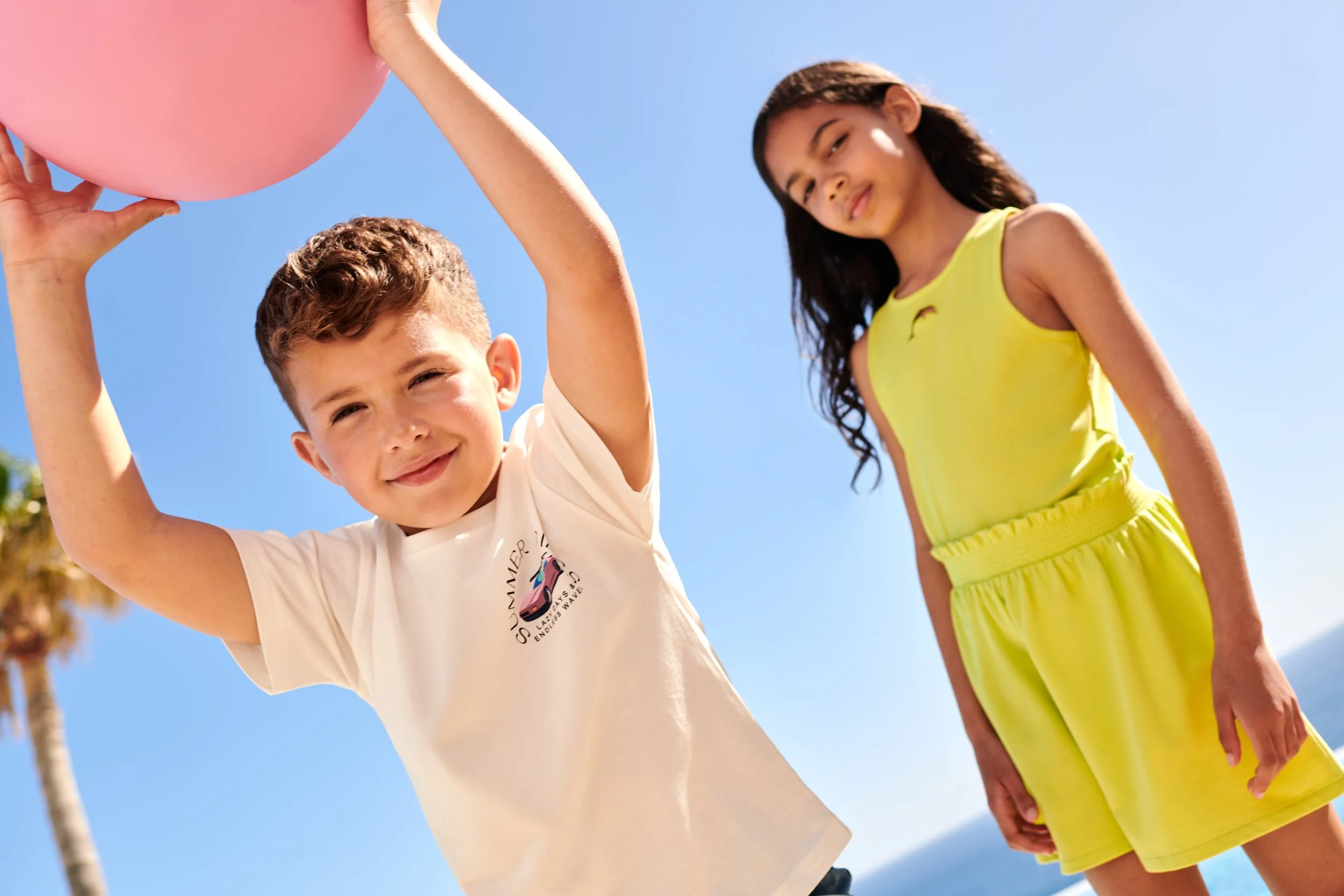 The creative direction was to present a playful poolside fashion edit of bold, bright and playful styles ready to match their kids summer energy. We shot this campaign on location in Mallorca against a minimal and modern poolside setting and offset with vibrant pops of colour using colourful graphic spheres which we floated on the graphic horizon line of an infinity pool. Offering playful props for the kids to interact with and contrasting tones to elevate and lift the product.